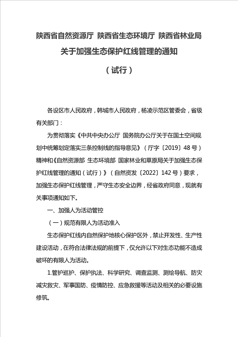 陕西省自然资源厅 陕西省生态环境厅 陕西省林业局关于加强生态保护红线管理的通知(试行)